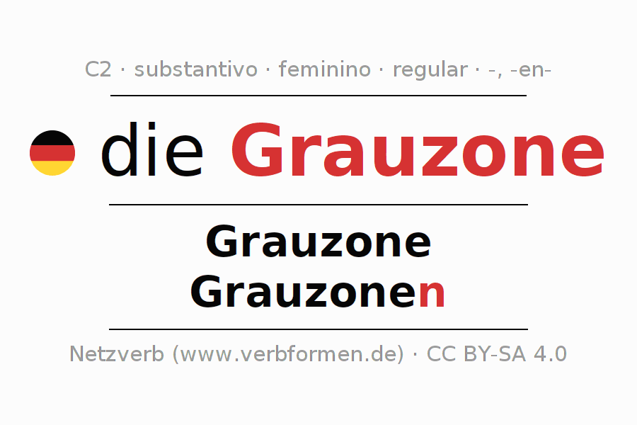 A declinação do substantivo Grauzone (zona cinzenta, zona intermediária) está no genitivo singular Grauzone e no nominativo plural Grauzonen . O substantivo fraco Grauzone é declinado com a terminação -/n. O gênero gramatical de Grauzone é feminino e o artigo definido é "die". Não se pode somente declinar o substantivo Grauzone mas sim todos os substantivos em alemão. O substantivo faz parte do vocabulário referente ao Certificado em Alemão do Nível C2. Comentários ☆