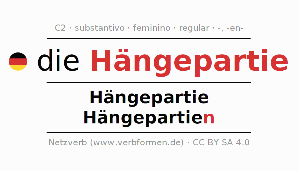 Declinação de Hängepartie é apresentada em uma tabela com todas as formas no singular e no plural (plural) e em todos os quatro casos: nominativo (1º caso), genitivo (2º caso), dativo (3º caso) e acusativo (4º caso) . Especialmente para os alunos de alemão, a correta declinação da palavra Hängepartie é fundamental.