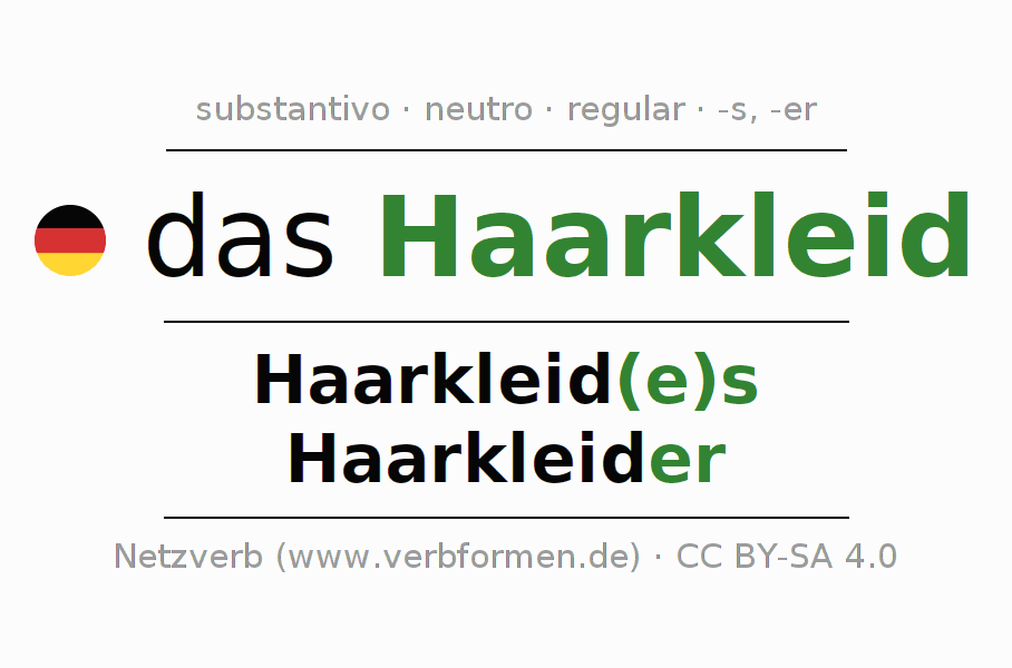 Declinação de Haarkleid é apresentada em uma tabela com todas as formas no singular e no plural (plural) e em todos os quatro casos: nominativo (1º caso), genitivo (2º caso), dativo (3º caso) e acusativo (4º caso) . Especialmente para os alunos de alemão, a correta declinação da palavra Haarkleid é fundamental.
