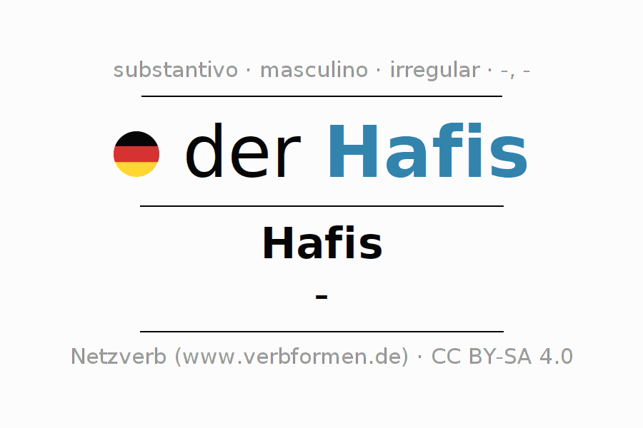 A declinação do substantivo Hafis (Hafiz) está no genitivo singular Hafis e no nominativo plural - . O substantivo Hafis é declinado com as terminações -/-. Não há formas no plural. O gênero gramatical de Hafis é masculino e o artigo definido é 'der'. Não se pode somente declinar o substantivo Hafis mas sim todos os substantivos em alemão. Comentários ☆