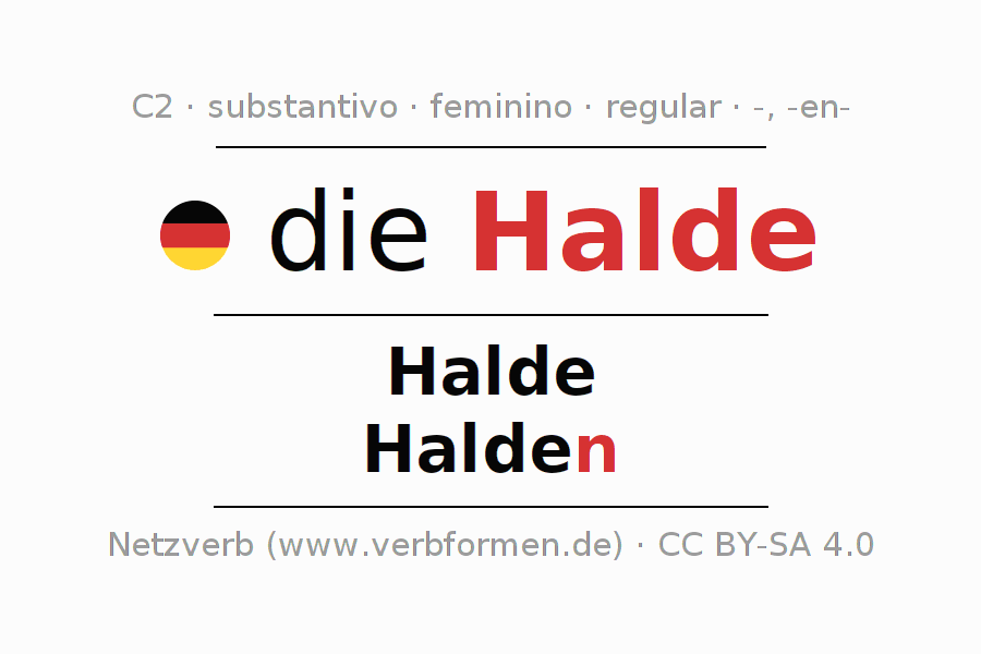 Declinação de Halde é apresentada em uma tabela com todas as formas no singular e no plural (plural) e em todos os quatro casos: nominativo (1º caso), genitivo (2º caso), dativo (3º caso) e acusativo (4º caso) . Especialmente para os alunos de alemão, a correta declinação da palavra Halde é fundamental.