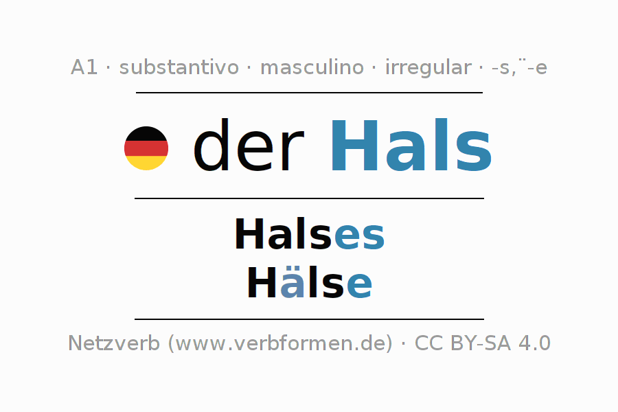 Declinação de Hals é apresentada em uma tabela com todas as formas no singular e no plural (plural) e em todos os quatro casos: nominativo (1º caso), genitivo (2º caso), dativo (3º caso) e acusativo (4º caso) . Especialmente para os alunos de alemão, a correta declinação da palavra Hals é fundamental.