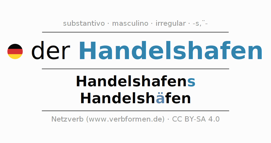 A declinação do substantivo Handelshafen (porto comercial) está no genitivo singular Handelshafens e no nominativo plural Handelshäfen . O substantivo forte Handelshafen é declinado com a terminação s/ä-. No plural com um trema. O gênero gramatical de Handelshafen é masculino e o artigo definido é 'der'. Não se pode somente declinar o substantivo Handelshafen mas sim todos os substantivos em alemão. Comentários ☆