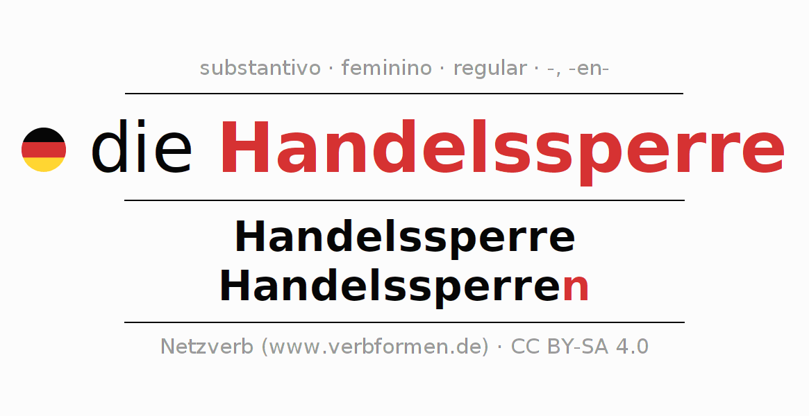 - Plural: die Handelssperren, der Handelssperren, den Handelssperren, die Handelssperren