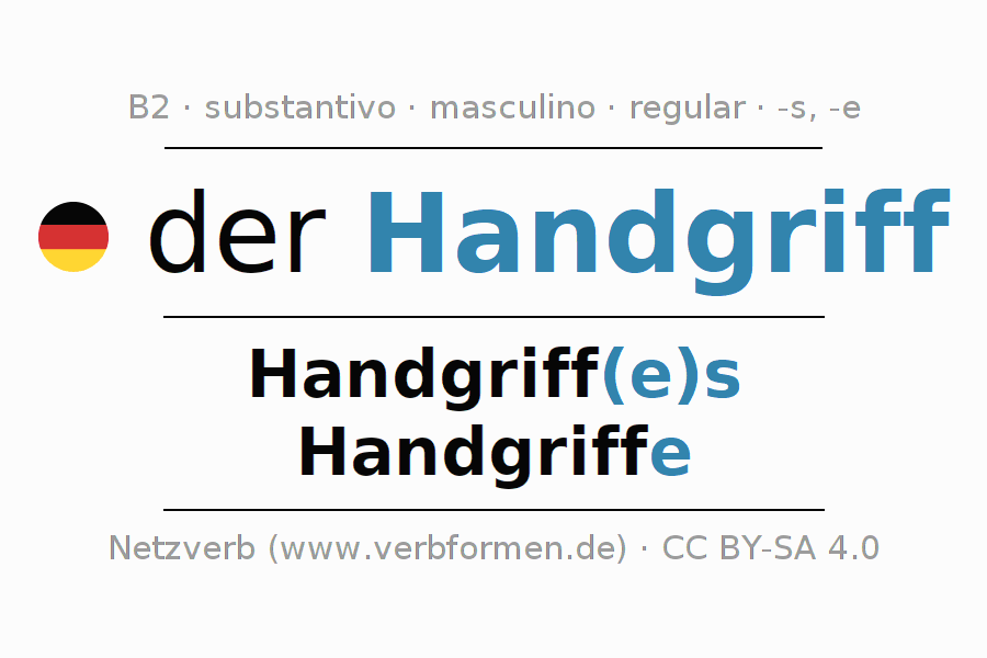 Declinação de Handgriff é apresentada em uma tabela com todas as formas no singular e no plural (plural) e em todos os quatro casos: nominativo (1º caso), genitivo (2º caso), dativo (3º caso) e acusativo (4º caso) . Especialmente para os alunos de alemão, a correta declinação da palavra Handgriff é fundamental.