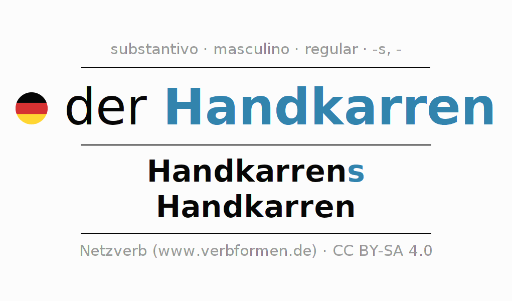 A declinação do substantivo Handkarren (carrinho, carrinho de mão) está no genitivo singular Handkarrens e no nominativo plural Handkarren . O substantivo forte Handkarren é declinado com a terminação s/-. O gênero gramatical de Handkarren é masculino e o artigo definido é 'der'. Não se pode somente declinar o substantivo Handkarren mas sim todos os substantivos em alemão. Comentários ☆