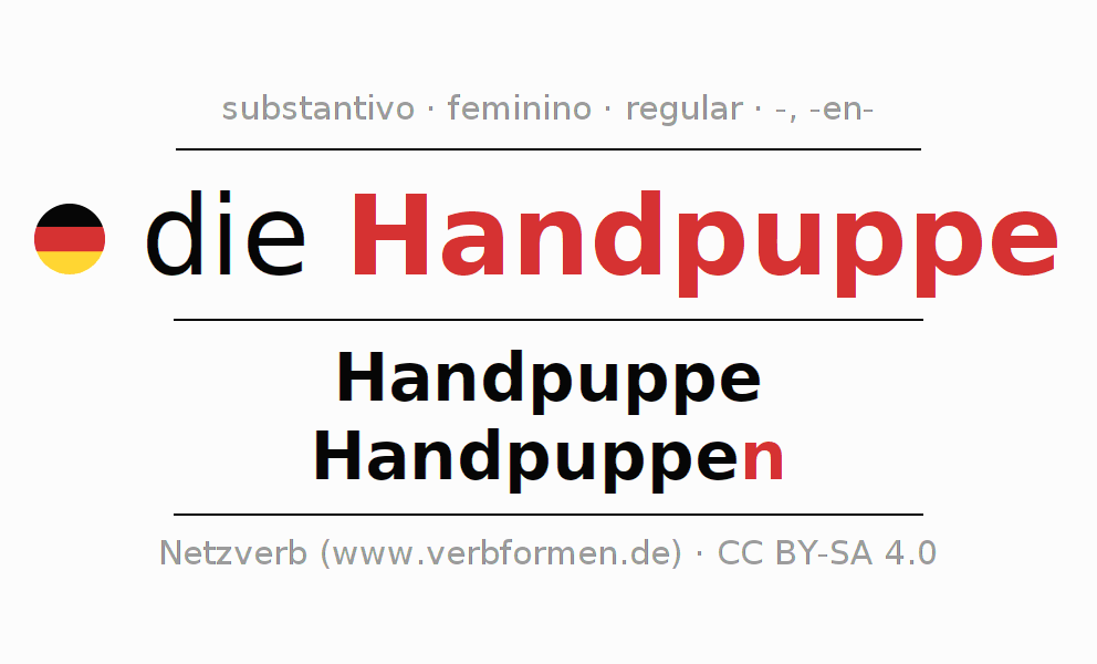 A declinação do substantivo Handpuppe (fantoche, marioneta) está no genitivo singular Handpuppe e no nominativo plural Handpuppen . O substantivo fraco Handpuppe é declinado com a terminação -/n. O gênero gramatical de Handpuppe é feminino e o artigo definido é "die". Não se pode somente declinar o substantivo Handpuppe mas sim todos os substantivos em alemão. Comentários ☆