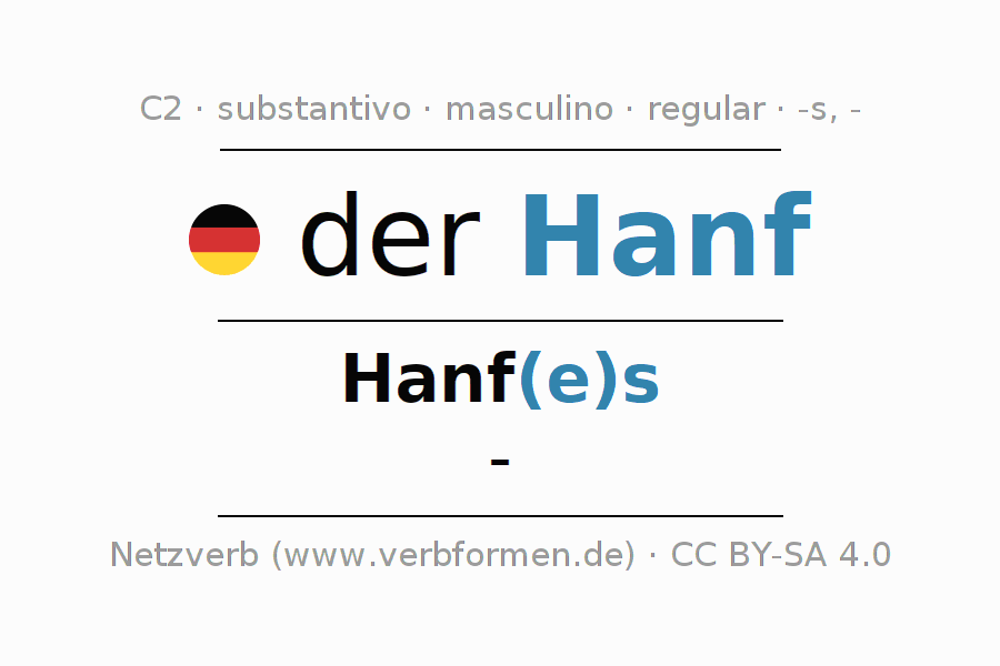 A declinação do substantivo Hanf (cânhamo) está no genitivo singular Hanf(e)s e no nominativo plural - . O substantivo forte Hanf é declinado com a terminação es/-. Não há formas no plural. O gênero gramatical de Hanf é masculino e o artigo definido é 'der'. Não se pode somente declinar o substantivo Hanf mas sim todos os substantivos em alemão. O substantivo faz parte do vocabulário referente ao Certificado em Alemão do Nível C2. Comentários ☆