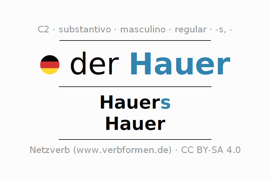Declinação de Hauer é apresentada em uma tabela com todas as formas no singular e no plural (plural) e em todos os quatro casos: nominativo (1º caso), genitivo (2º caso), dativo (3º caso) e acusativo (4º caso) . Especialmente para os alunos de alemão, a correta declinação da palavra Hauer é fundamental.