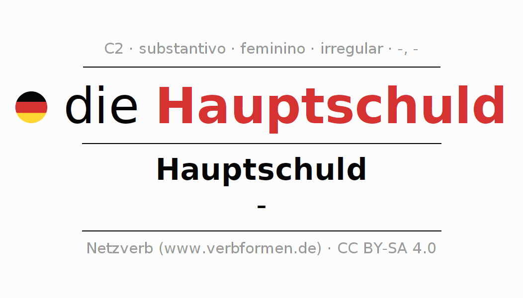 A declinação do substantivo Hauptschuld (maior parte da dívida, principal dívida) está no genitivo singular Hauptschuld e no nominativo plural - . O substantivo Hauptschuld é declinado com as terminações -/-. Não há formas no plural. O gênero gramatical de Hauptschuld é feminino e o artigo definido é "die". Não se pode somente declinar o substantivo Hauptschuld mas sim todos os substantivos em alemão. O substantivo faz parte do vocabulário referente ao Certificado em Alemão do Nível C2. Comentários ☆