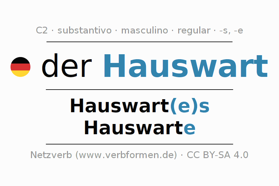 A declinação do substantivo Hauswart (zelador, porteiro) está no genitivo singular Hauswart(e)s e no nominativo plural Hauswarte . O substantivo forte Hauswart é declinado com a terminação es/e. O gênero gramatical de Hauswart é masculino e o artigo definido é 'der'. Não se pode somente declinar o substantivo Hauswart mas sim todos os substantivos em alemão. O substantivo faz parte do vocabulário referente ao Certificado em Alemão do Nível C2. Comentários ☆