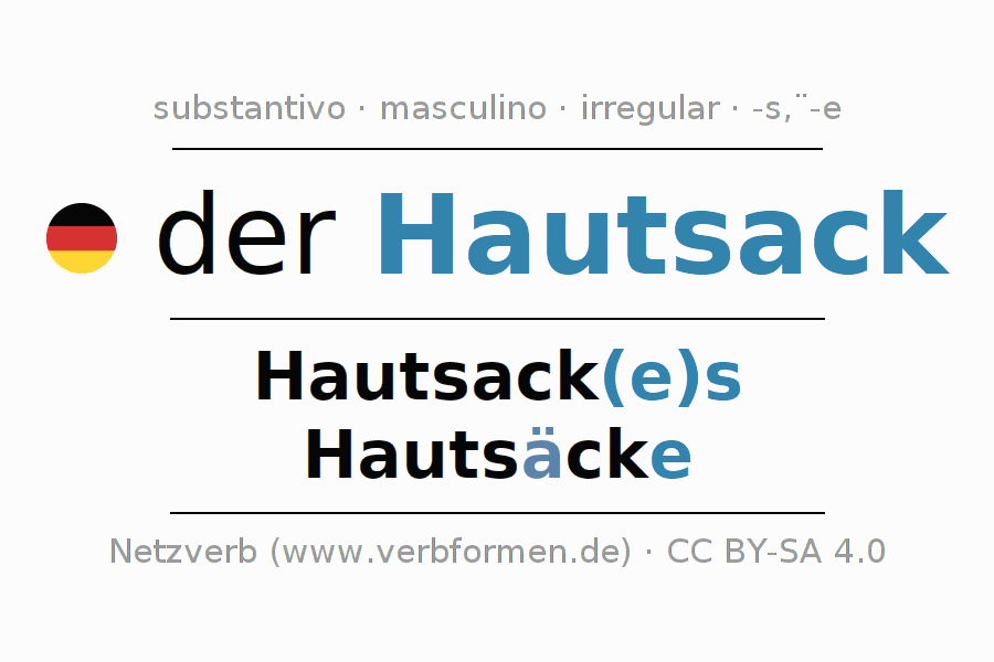 Declinação de Hautsack é apresentada em uma tabela com todas as formas no singular e no plural (plural) e em todos os quatro casos: nominativo (1º caso), genitivo (2º caso), dativo (3º caso) e acusativo (4º caso) . Especialmente para os alunos de alemão, a correta declinação da palavra Hautsack é fundamental.