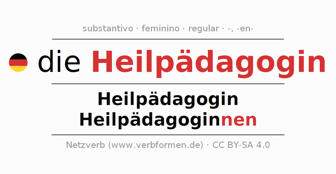 A declinação do substantivo Heilpädagogin (educadora especial) está no genitivo singular Heilpädagogin e no nominativo plural Heilpädagoginnen . O substantivo fraco Heilpädagogin é declinado com a terminação -/nen. O gênero gramatical de Heilpädagogin é feminino e o artigo definido é "die". Não se pode somente declinar o substantivo Heilpädagogin mas sim todos os substantivos em alemão. Comentários ☆