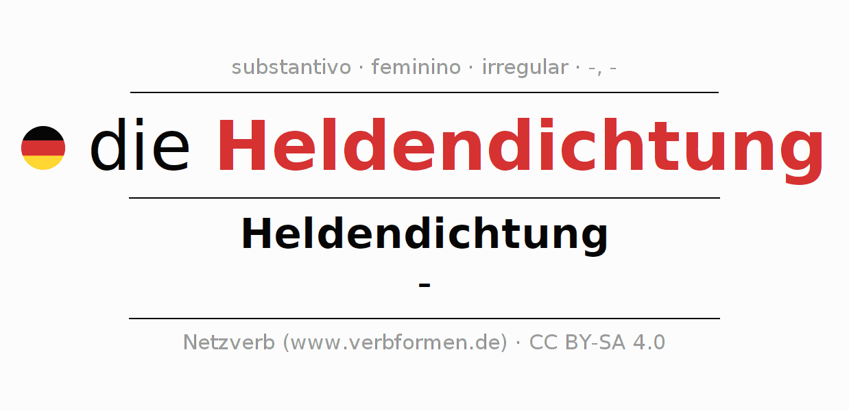A declinação do substantivo Heldendichtung (poesia épica) está no genitivo singular Heldendichtung e no nominativo plural - . O substantivo Heldendichtung é declinado com as terminações -/-. Não há formas no plural. O gênero gramatical de Heldendichtung é feminino e o artigo definido é "die". Não se pode somente declinar o substantivo Heldendichtung mas sim todos os substantivos em alemão. Comentários ☆
