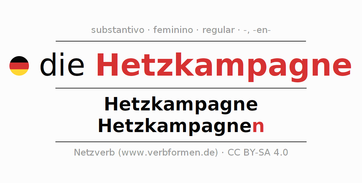 A declinação do substantivo Hetzkampagne (campanha de difamação, campanha difamatória) está no genitivo singular Hetzkampagne e no nominativo plural Hetzkampagnen . O substantivo fraco Hetzkampagne é declinado com a terminação -/n. O gênero gramatical de Hetzkampagne é feminino e o artigo definido é "die". Não se pode somente declinar o substantivo Hetzkampagne mas sim todos os substantivos em alemão. Comentários ☆