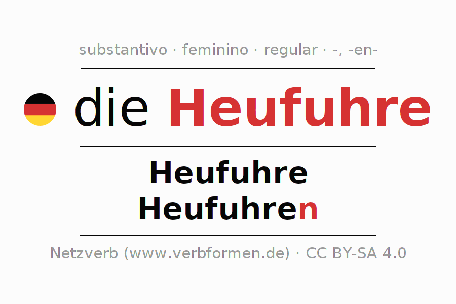 A declinação do substantivo Heufuhre está no genitivo singular Heufuhre e no nominativo plural Heufuhren . O substantivo fraco Heufuhre é declinado com a terminação -/n. O gênero gramatical de Heufuhre é feminino e o artigo definido é "die". Não se pode somente declinar o substantivo Heufuhre mas sim todos os substantivos em alemão. Comentários ☆