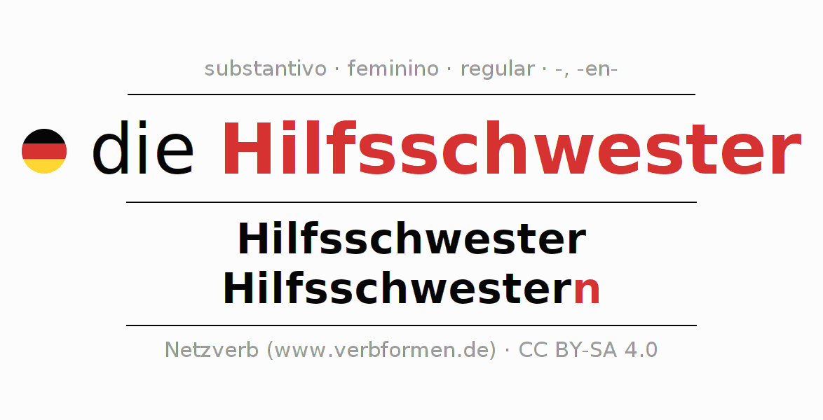 A declinação do substantivo Hilfsschwester (auxiliar de enfermagem) está no genitivo singular Hilfsschwester e no nominativo plural Hilfsschwestern . O substantivo fraco Hilfsschwester é declinado com a terminação -/n. O gênero gramatical de Hilfsschwester é feminino e o artigo definido é "die". Não se pode somente declinar o substantivo Hilfsschwester mas sim todos os substantivos em alemão. Comentários ☆