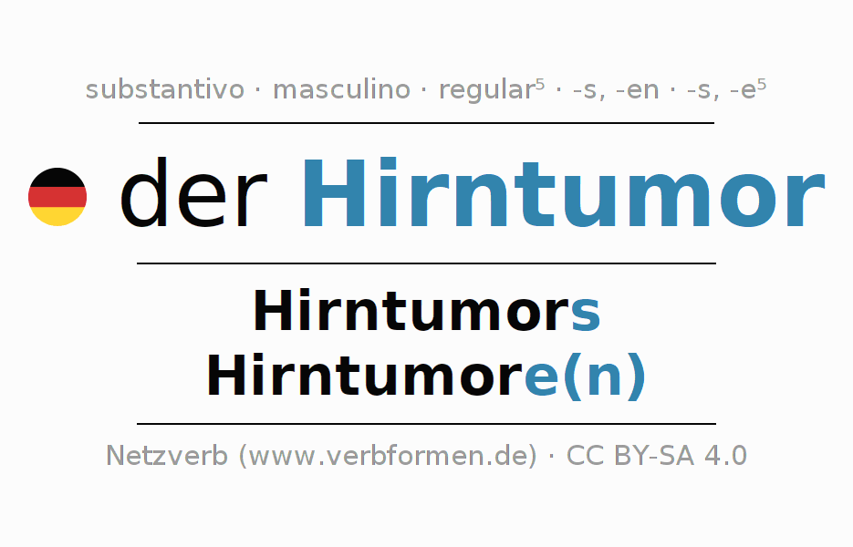A declinação do substantivo Hirntumor (tumor cerebral) está no genitivo singular Hirntumors e no nominativo plural Hirntumore(n) . O substantivo misto Hirntumor é declinado com a terminação s/en/e. O gênero gramatical de Hirntumor é masculino e o artigo definido é 'der'. Não se pode somente declinar o substantivo Hirntumor mas sim todos os substantivos em alemão. Comentários ☆