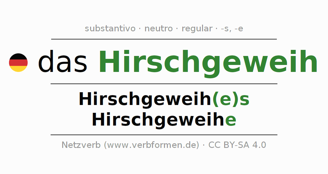 A declinação do substantivo Hirschgeweih (chifre de cervo, galhada de veado) está no genitivo singular Hirschgeweih(e)s e no nominativo plural Hirschgeweihe . O substantivo forte Hirschgeweih é declinado com a terminação es/e. O gênero gramatical de Hirschgeweih é neutro e o artigo definido é "das". Não se pode somente declinar o substantivo Hirschgeweih mas sim todos os substantivos em alemão. Comentários ☆