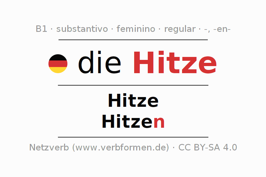 Declinação de Hitze é apresentada em uma tabela com todas as formas no singular e no plural (plural) e em todos os quatro casos: nominativo (1º caso), genitivo (2º caso), dativo (3º caso) e acusativo (4º caso) . Especialmente para os alunos de alemão, a correta declinação da palavra Hitze é fundamental.