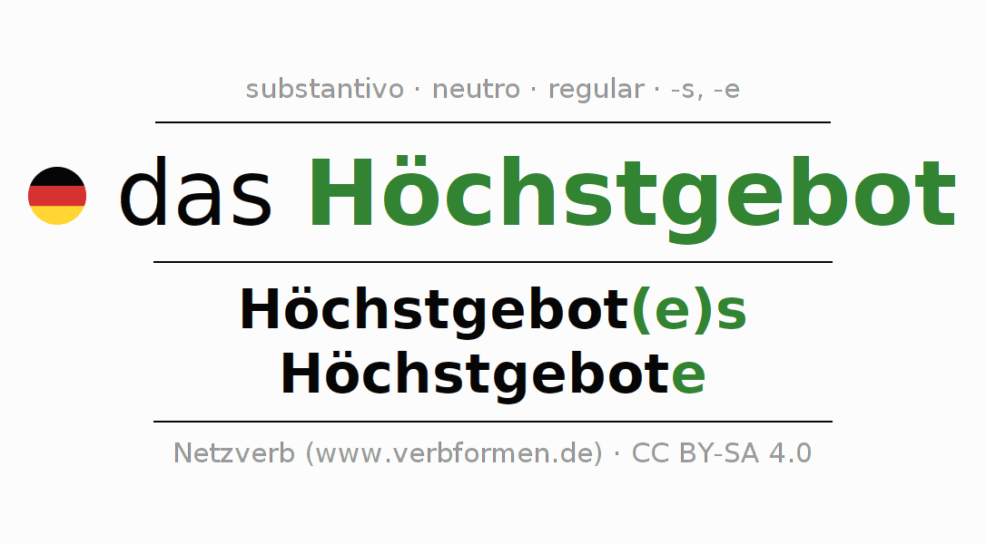 A declinação do substantivo Höchstgebot (oferta máxima) está no genitivo singular Höchstgebot(e)s e no nominativo plural Höchstgebote . O substantivo forte Höchstgebot é declinado com a terminação es/e. O gênero gramatical de Höchstgebot é neutro e o artigo definido é "das". Não se pode somente declinar o substantivo Höchstgebot mas sim todos os substantivos em alemão. Comentários ☆