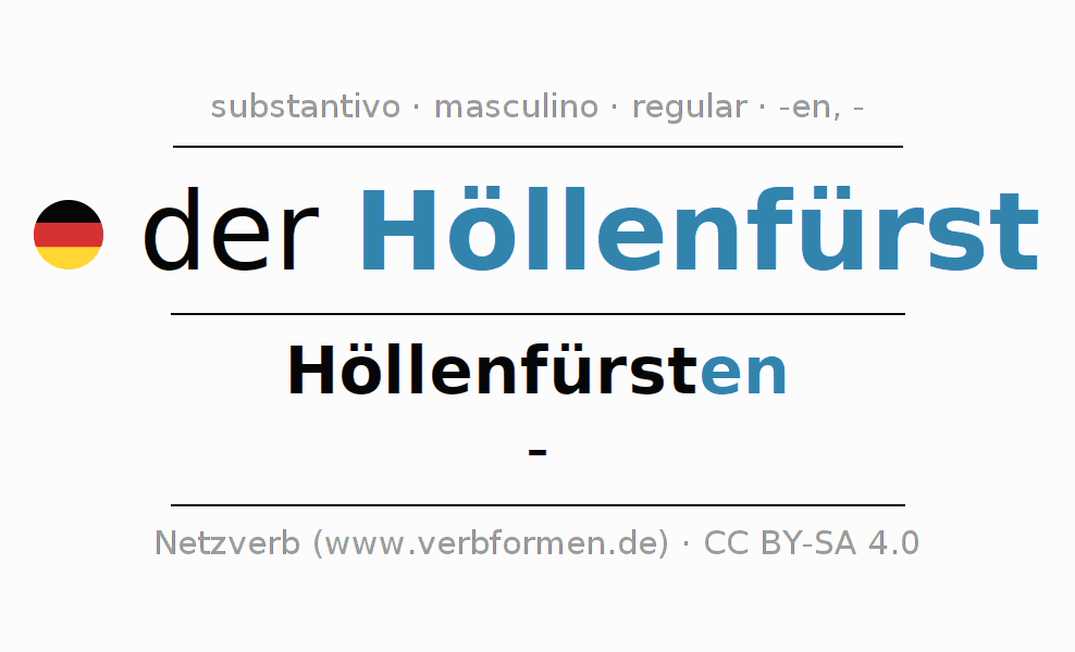 A declinação do substantivo Höllenfürst (príncipe do inferno) está no genitivo singular Höllenfürsten e no nominativo plural - . O substantivo forte Höllenfürst é declinado com a terminação en/-. Não há formas no plural. O gênero gramatical de Höllenfürst é masculino e o artigo definido é 'der'. Não se pode somente declinar o substantivo Höllenfürst mas sim todos os substantivos em alemão. Comentários ☆