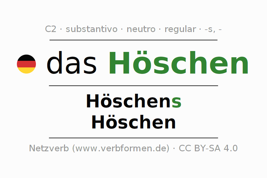 Declinação de Höschen é apresentada em uma tabela com todas as formas no singular e no plural (plural) e em todos os quatro casos: nominativo (1º caso), genitivo (2º caso), dativo (3º caso) e acusativo (4º caso) . Especialmente para os alunos de alemão, a correta declinação da palavra Höschen é fundamental.