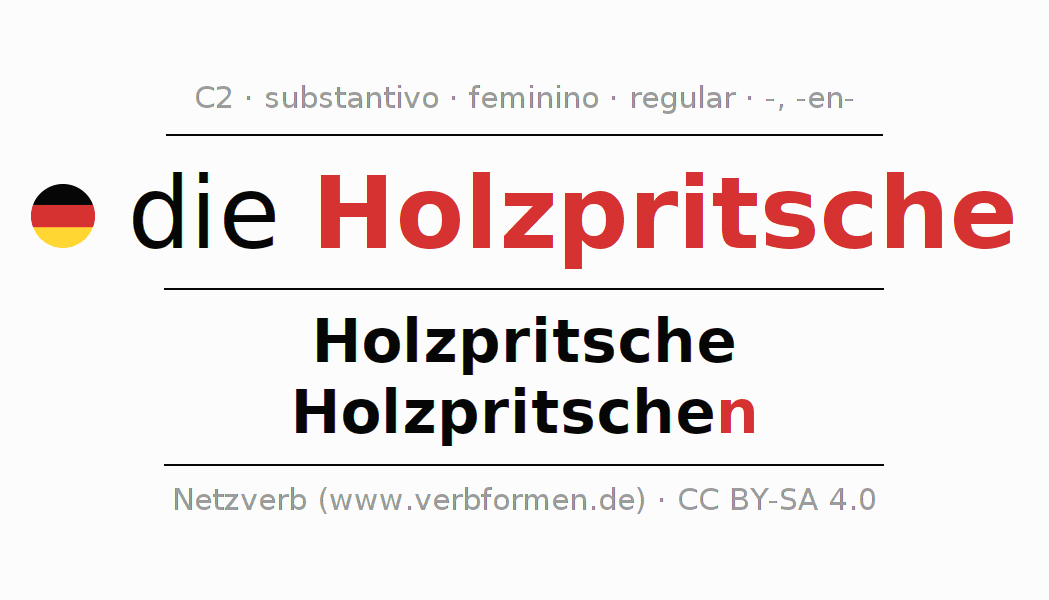 Declinação de Holzpritsche é apresentada em uma tabela com todas as formas no singular e no plural (plural) e em todos os quatro casos: nominativo (1º caso), genitivo (2º caso), dativo (3º caso) e acusativo (4º caso) . Especialmente para os alunos de alemão, a correta declinação da palavra Holzpritsche é fundamental.