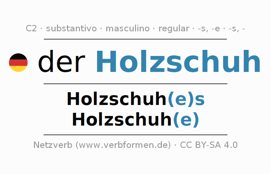 Declinação de Holzschuh é apresentada em uma tabela com todas as formas no singular e no plural (plural) e em todos os quatro casos: nominativo (1º caso), genitivo (2º caso), dativo (3º caso) e acusativo (4º caso) . Especialmente para os alunos de alemão, a correta declinação da palavra Holzschuh é fundamental.