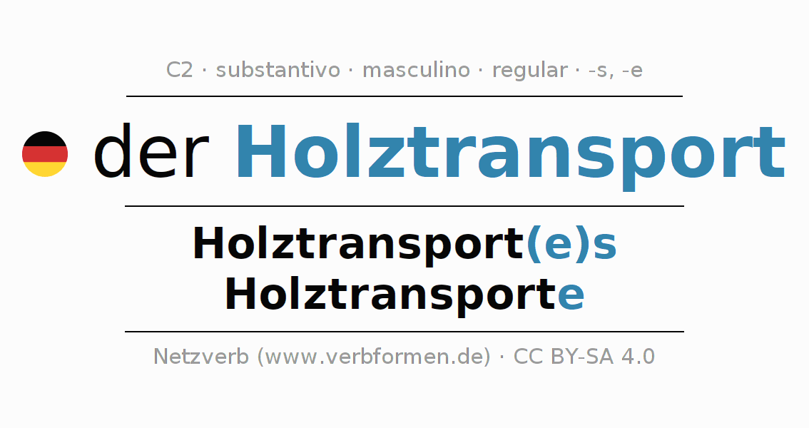 A declinação do substantivo Holztransport (transporte de madeira) está no genitivo singular Holztransport(e)s e no nominativo plural Holztransporte . O substantivo forte Holztransport é declinado com a terminação es/e. O gênero gramatical de Holztransport é masculino e o artigo definido é 'der'. Não se pode somente declinar o substantivo Holztransport mas sim todos os substantivos em alemão. O substantivo faz parte do vocabulário referente ao Certificado em Alemão do Nível C2. Comentários ☆