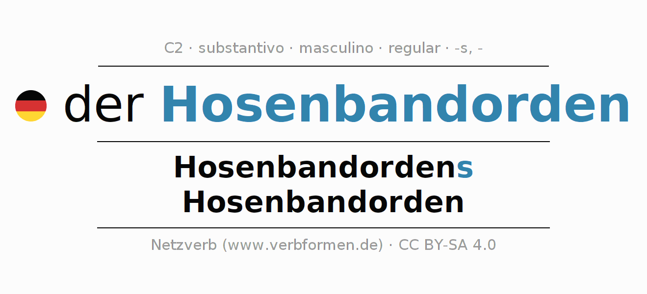 Declinação de Hosenbandorden é apresentada em uma tabela com todas as formas no singular e no plural (plural) e em todos os quatro casos: nominativo (1º caso), genitivo (2º caso), dativo (3º caso) e acusativo (4º caso) . Especialmente para os alunos de alemão, a correta declinação da palavra Hosenbandorden é fundamental.
