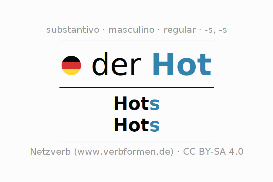 Declinação de Hot é apresentada em uma tabela com todas as formas no singular e no plural (plural) e em todos os quatro casos: nominativo (1º caso), genitivo (2º caso), dativo (3º caso) e acusativo (4º caso) . Especialmente para os alunos de alemão, a correta declinação da palavra Hot é fundamental.