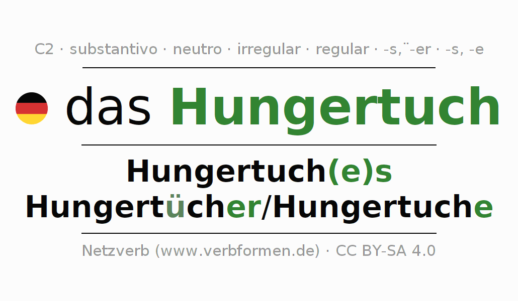 Declinação de Hungertuch é apresentada em uma tabela com todas as formas no singular e no plural (plural) e em todos os quatro casos: nominativo (1º caso), genitivo (2º caso), dativo (3º caso) e acusativo (4º caso) . Especialmente para os alunos de alemão, a correta declinação da palavra Hungertuch é fundamental.