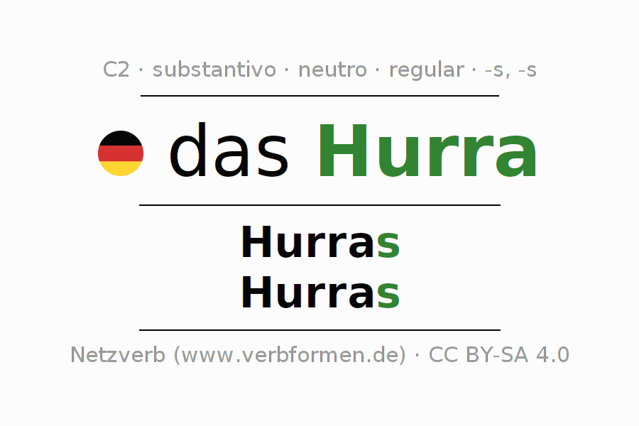 Declinação de Hurra é apresentada em uma tabela com todas as formas no singular e no plural (plural) e em todos os quatro casos: nominativo (1º caso), genitivo (2º caso), dativo (3º caso) e acusativo (4º caso) . Especialmente para os alunos de alemão, a correta declinação da palavra Hurra é fundamental.