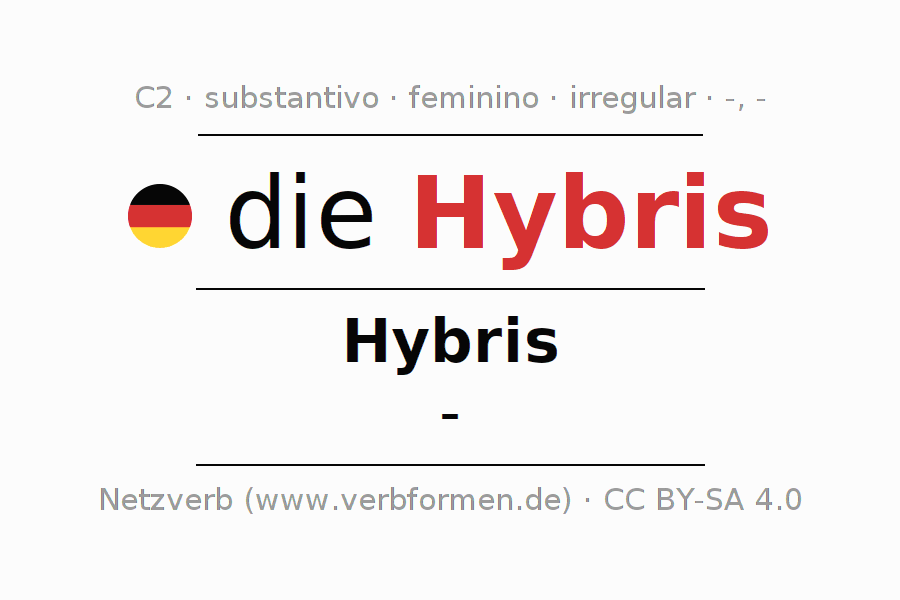 Declinação de Hybris é apresentada em uma tabela com todas as formas no singular e no plural (plural) e em todos os quatro casos: nominativo (1º caso), genitivo (2º caso), dativo (3º caso) e acusativo (4º caso) . Especialmente para os alunos de alemão, a correta declinação da palavra Hybris é fundamental.
