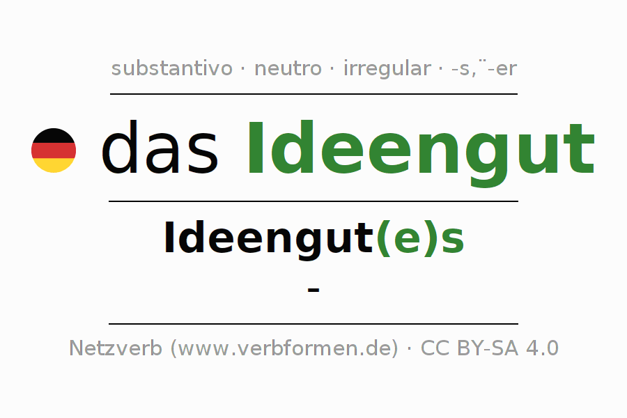 A declinação do substantivo Ideengut (conjunto de ideias, corpus de ideias) está no genitivo singular Ideengut(e)s e no nominativo plural - . O substantivo forte Ideengut é declinado com a terminação es/-. No plural com um trema. Não há formas no plural. O gênero gramatical de Ideengut é neutro e o artigo definido é "das". Não se pode somente declinar o substantivo Ideengut mas sim todos os substantivos em alemão. Comentários ☆