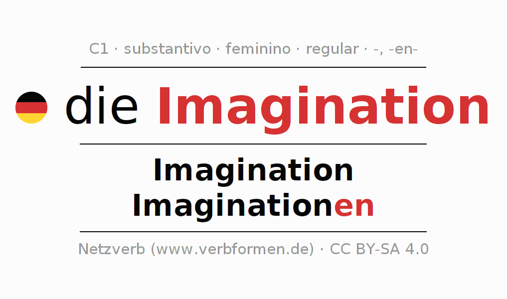 Declinação de Imagination é apresentada em uma tabela com todas as formas no singular e no plural (plural) e em todos os quatro casos: nominativo (1º caso), genitivo (2º caso), dativo (3º caso) e acusativo (4º caso) . Especialmente para os alunos de alemão, a correta declinação da palavra Imagination é fundamental.