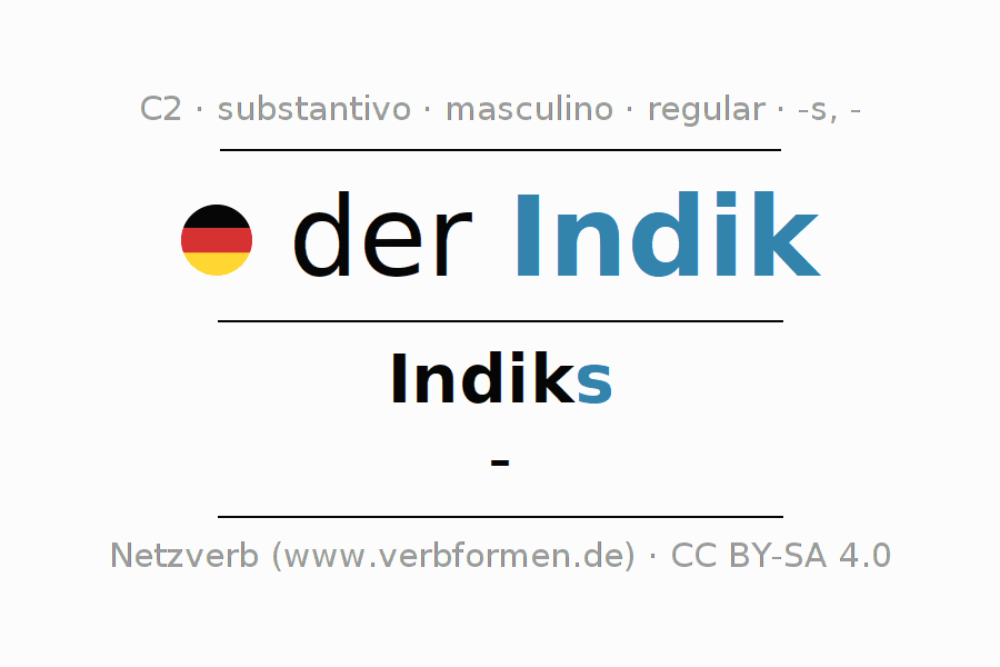 Declinação de Indik é apresentada em uma tabela com todas as formas no singular e no plural (plural) e em todos os quatro casos: nominativo (1º caso), genitivo (2º caso), dativo (3º caso) e acusativo (4º caso) . Especialmente para os alunos de alemão, a correta declinação da palavra Indik é fundamental.