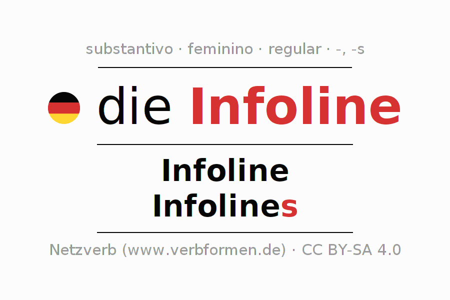 A declinação do substantivo Infoline (linha de informações) está no genitivo singular Infoline e no nominativo plural Infolines . O substantivo forte Infoline é declinado com a terminação -/s. O gênero gramatical de Infoline é feminino e o artigo definido é "die". Não se pode somente declinar o substantivo Infoline mas sim todos os substantivos em alemão. Comentários ☆