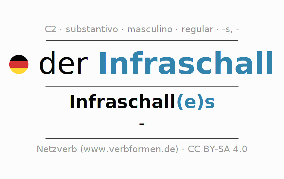 A declinação do substantivo Infraschall (infrasom, infrassom) está no genitivo singular Infraschall(e)s e no nominativo plural - . O substantivo forte Infraschall é declinado com a terminação es/-. Não há formas no plural. O gênero gramatical de Infraschall é masculino e o artigo definido é 'der'. Não se pode somente declinar o substantivo Infraschall mas sim todos os substantivos em alemão. O substantivo faz parte do vocabulário referente ao Certificado em Alemão do Nível C2. Comentários ☆