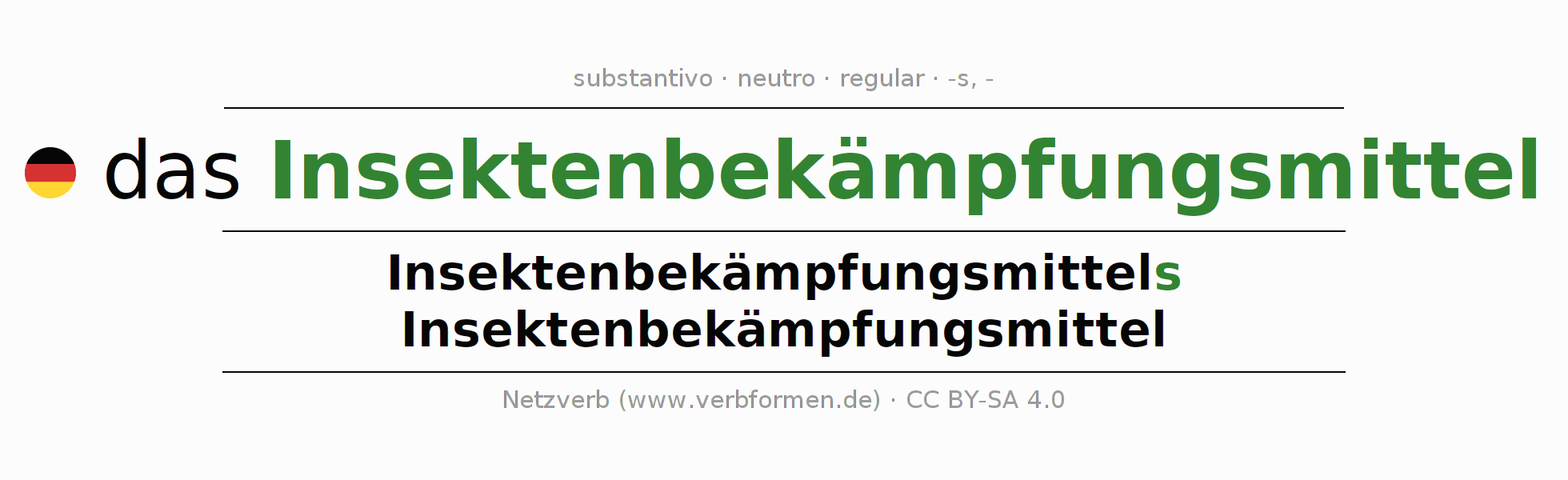 A declinação do substantivo Insektenbekämpfungsmittel (inseticida, produto inseticida) está no genitivo singular Insektenbekämpfungsmittels e no nominativo plural Insektenbekämpfungsmittel . O substantivo forte Insektenbekämpfungsmittel é declinado com a terminação s/-. O gênero gramatical de Insektenbekämpfungsmittel é neutro e o artigo definido é "das". Não se pode somente declinar o substantivo Insektenbekämpfungsmittel mas sim todos os substantivos em alemão. Comentários ☆