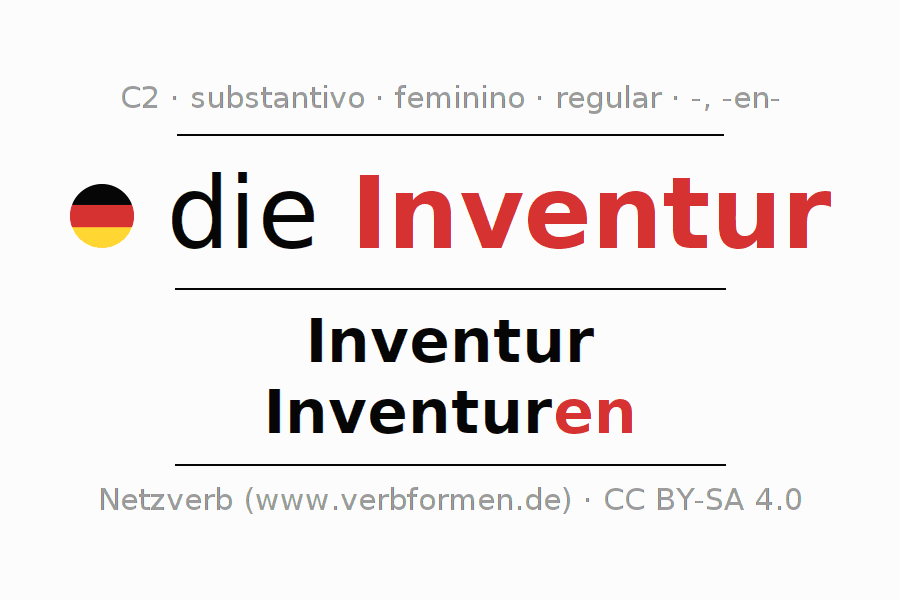 - Plural: die Inventuren, der Inventuren, den Inventuren, die Inventuren