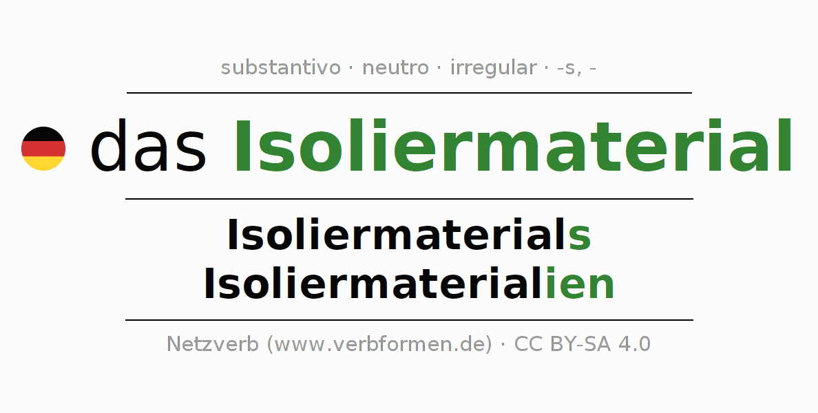 A declinação do substantivo Isoliermaterial (isolante, material isolante) está no genitivo singular Isoliermaterials e no nominativo plural Isoliermaterialien . O substantivo Isoliermaterial é declinado com as terminações s/ien. O gênero gramatical de Isoliermaterial é neutro e o artigo definido é "das". Não se pode somente declinar o substantivo Isoliermaterial mas sim todos os substantivos em alemão. Comentários ☆