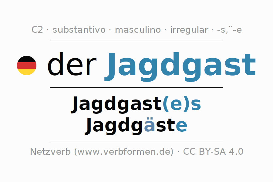 A declinação do substantivo Jagdgast (convidado para a caça) está no genitivo singular Jagdgast(e)s e no nominativo plural Jagdgäste . O substantivo forte Jagdgast é declinado com a terminação es/ä-e. No plural com um trema. O gênero gramatical de Jagdgast é masculino e o artigo definido é 'der'. Não se pode somente declinar o substantivo Jagdgast mas sim todos os substantivos em alemão. O substantivo faz parte do vocabulário referente ao Certificado em Alemão do Nível C2. Comentários ☆
