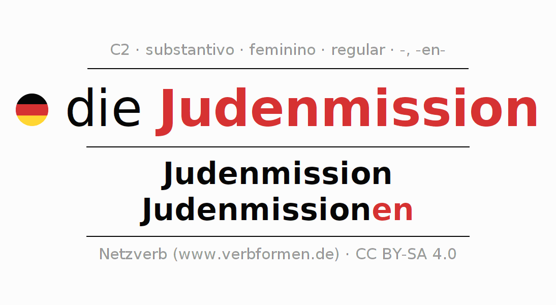 A declinação do substantivo Judenmission (missão aos judeus) está no genitivo singular Judenmission e no nominativo plural Judenmissionen . O substantivo fraco Judenmission é declinado com a terminação -/en. O gênero gramatical de Judenmission é feminino e o artigo definido é "die". Não se pode somente declinar o substantivo Judenmission mas sim todos os substantivos em alemão. O substantivo faz parte do vocabulário referente ao Certificado em Alemão do Nível C2. Comentários ☆