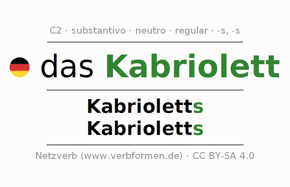 A declinação do substantivo Kabriolett (cabriolet, conversível) está no genitivo singular Kabrioletts e no nominativo plural Kabrioletts . O substantivo forte Kabriolett é declinado com a terminação s/s. O gênero gramatical de Kabriolett é neutro e o artigo definido é "das". Não se pode somente declinar o substantivo Kabriolett mas sim todos os substantivos em alemão. O substantivo faz parte do vocabulário referente ao Certificado em Alemão do Nível C2. Comentários ☆