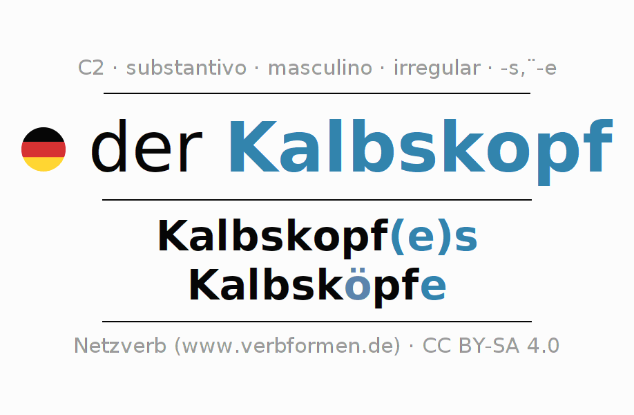 Declinação de Kalbskopf é apresentada em uma tabela com todas as formas no singular e no plural (plural) e em todos os quatro casos: nominativo (1º caso), genitivo (2º caso), dativo (3º caso) e acusativo (4º caso) . Especialmente para os alunos de alemão, a correta declinação da palavra Kalbskopf é fundamental.