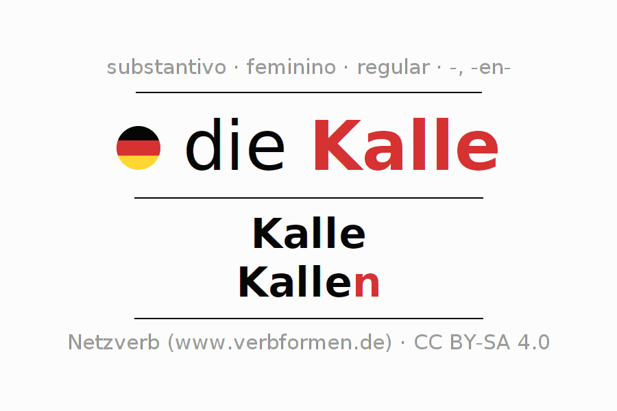 Declinação de Kalle é apresentada em uma tabela com todas as formas no singular e no plural (plural) e em todos os quatro casos: nominativo (1º caso), genitivo (2º caso), dativo (3º caso) e acusativo (4º caso) . Especialmente para os alunos de alemão, a correta declinação da palavra Kalle é fundamental.