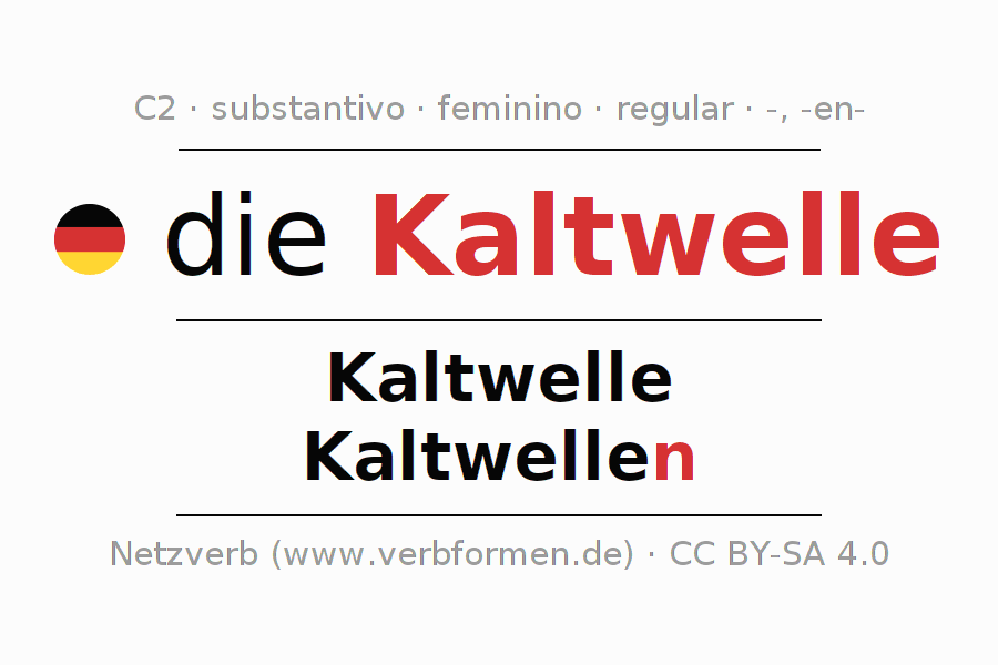 Declinação de Kaltwelle é apresentada em uma tabela com todas as formas no singular e no plural (plural) e em todos os quatro casos: nominativo (1º caso), genitivo (2º caso), dativo (3º caso) e acusativo (4º caso) . Especialmente para os alunos de alemão, a correta declinação da palavra Kaltwelle é fundamental.