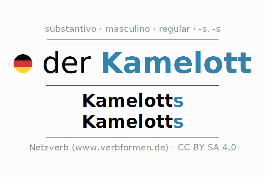 A declinação do substantivo Kamelott está no genitivo singular Kamelotts e no nominativo plural Kamelotts . O substantivo forte Kamelott é declinado com a terminação s/s. Mas pode também ser usado para outros fins. O gênero gramatical de Kamelott é masculino e o artigo definido é 'der'. Não se pode somente declinar o substantivo Kamelott mas sim todos os substantivos em alemão. Comentários ☆